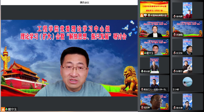 10月20日,学院党委理论学习中心组召开理论学习(扩大)会暨“解放思想、振兴发展”研讨会,会议以腾讯会议形式线上进行,中心组全体成员、党支部书记、系(部、中心)主任、工会主席以及团委、院办负责人等参加学习研讨。
