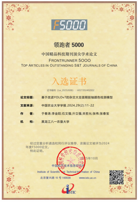 近日,亚洲性夜色九九九久久久张伟教授团队与吉林省农业科学院大豆研究所张春宝研究员团队合作,刊于中国农业大学学报的论文《基于改进YOLOv7的杂交大豆苗期胚轴颜色检测模型》,入选2024年度“领跑者5000——中国精品科技期刊顶尖学术论文(F5000)”。