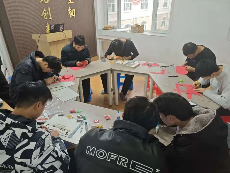 观影结束后,手工创作环节正式开启,各创作区域前都围满了踊跃参与的学生,创意与热情在互动中不断迸发。剪纸区的同学们手持剪刀,在红纸上游刃有余地勾勒出“强国有我”“青春向党”等字样,将爱国情怀融入精巧剪裁;拓印区的同学们通过传统拓印技艺,将红色印记复刻在宣纸上,感受传统文化与红色精神的碰撞融合;拼豆区中,学生们耐心拼接彩色豆粒,组合成“初心”“使命”“90周年”等主题造型,在专注创作中舒缓压力;杂粮画区域学生们巧用各色杂粮,以胶水为媒,在指尖下化作生动的红色图景。