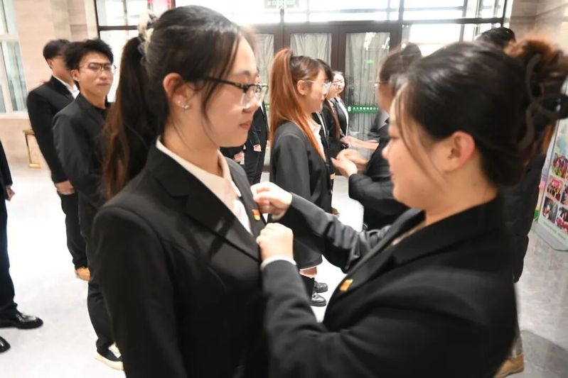 宣誓完毕后,王小婷、孙浩楠、田宛鑫为预备党员佩戴党徽,并勉励大家要时刻牢记入党誓词,践行党的宗旨,在今后的学习、工作和生活中,充分发挥先锋模范作用,将个人成长融入国家发展和学院建设的宏伟事业中,努力成长为堪当民族复兴大任的时代新人。